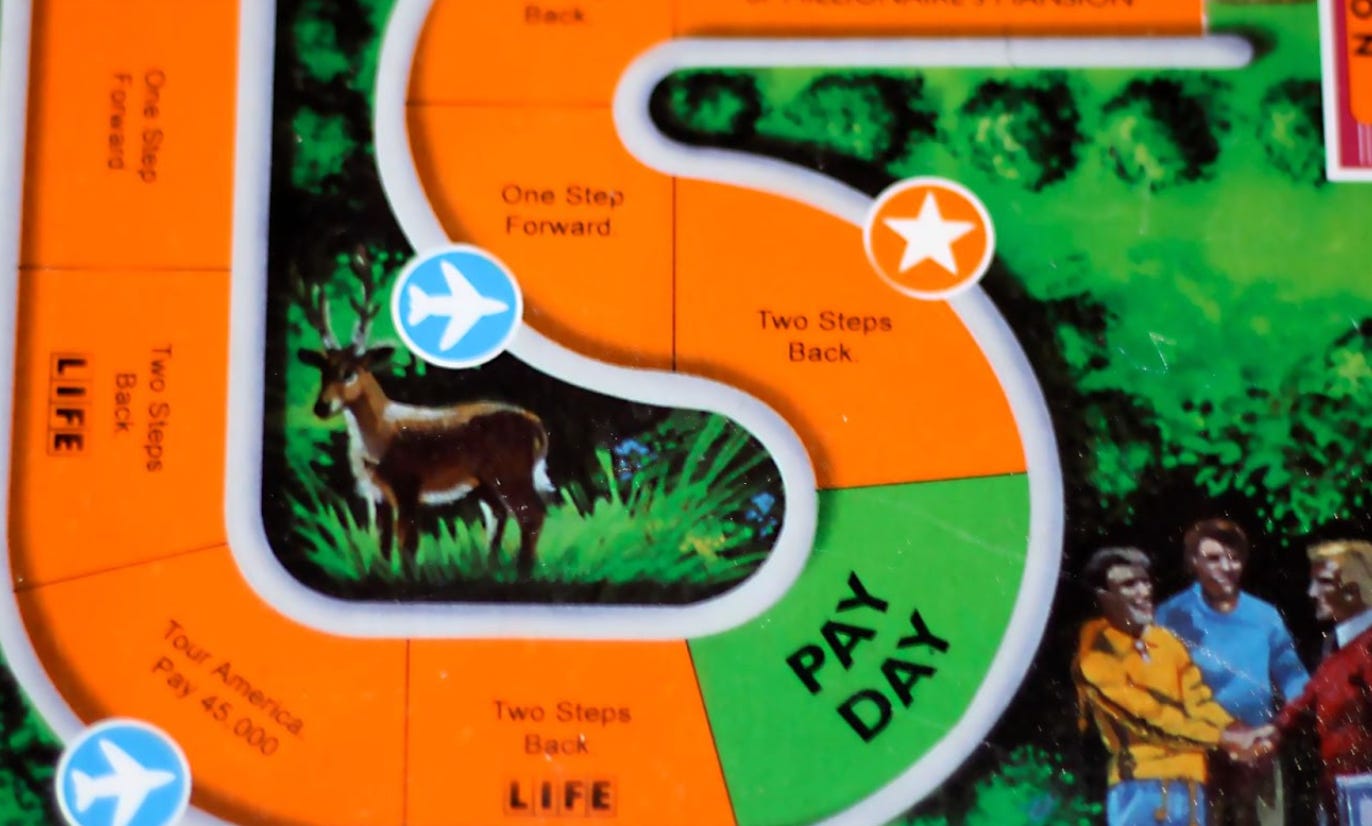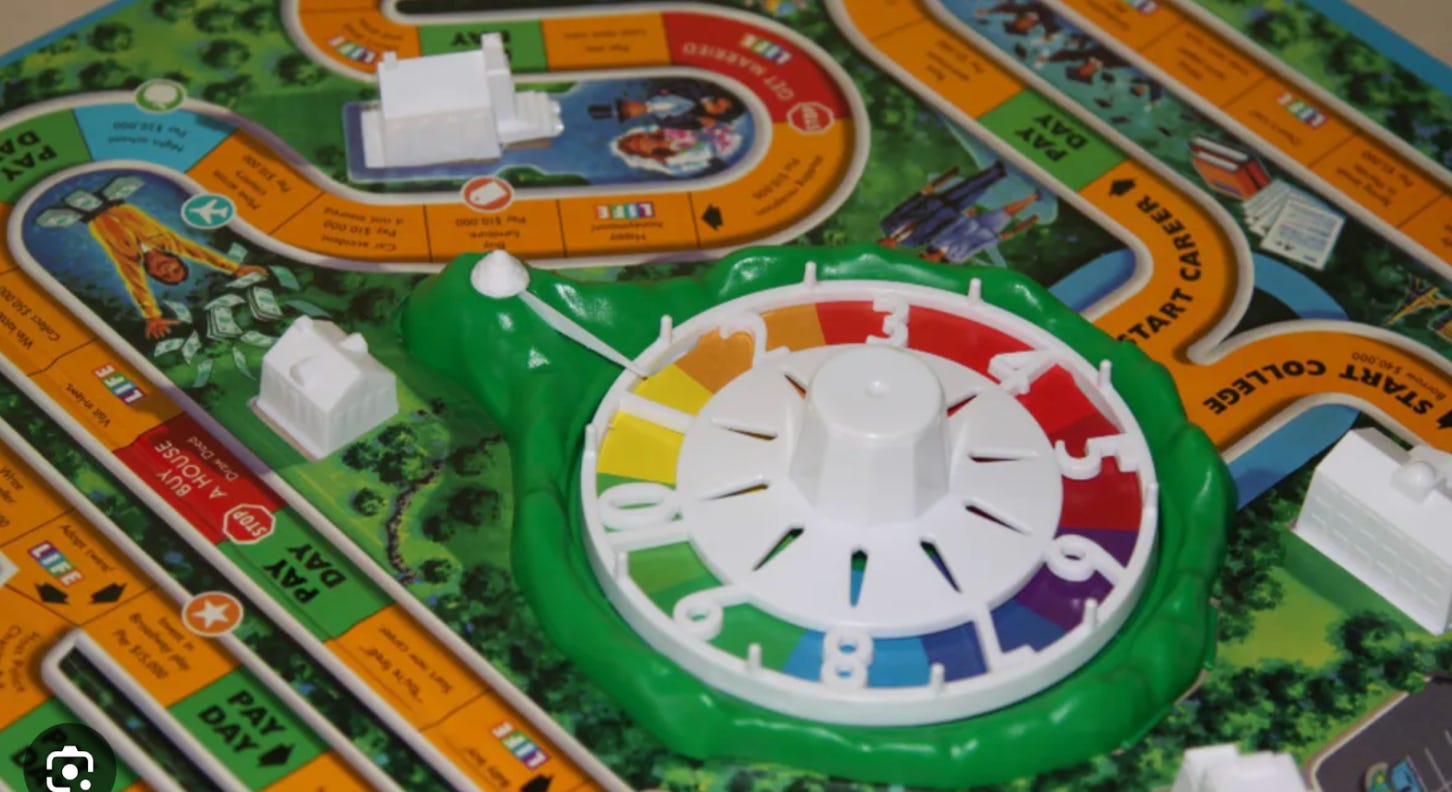 I’d recently played the old classic Game of Life, in which you spin a wheel and move your little car around a winding board, making life decisions along the way (going to college, choosing a career, getting married, having kids) and collecting or paying money at each stop. Whoever retires with the most wealth at the end wins. Riveting.