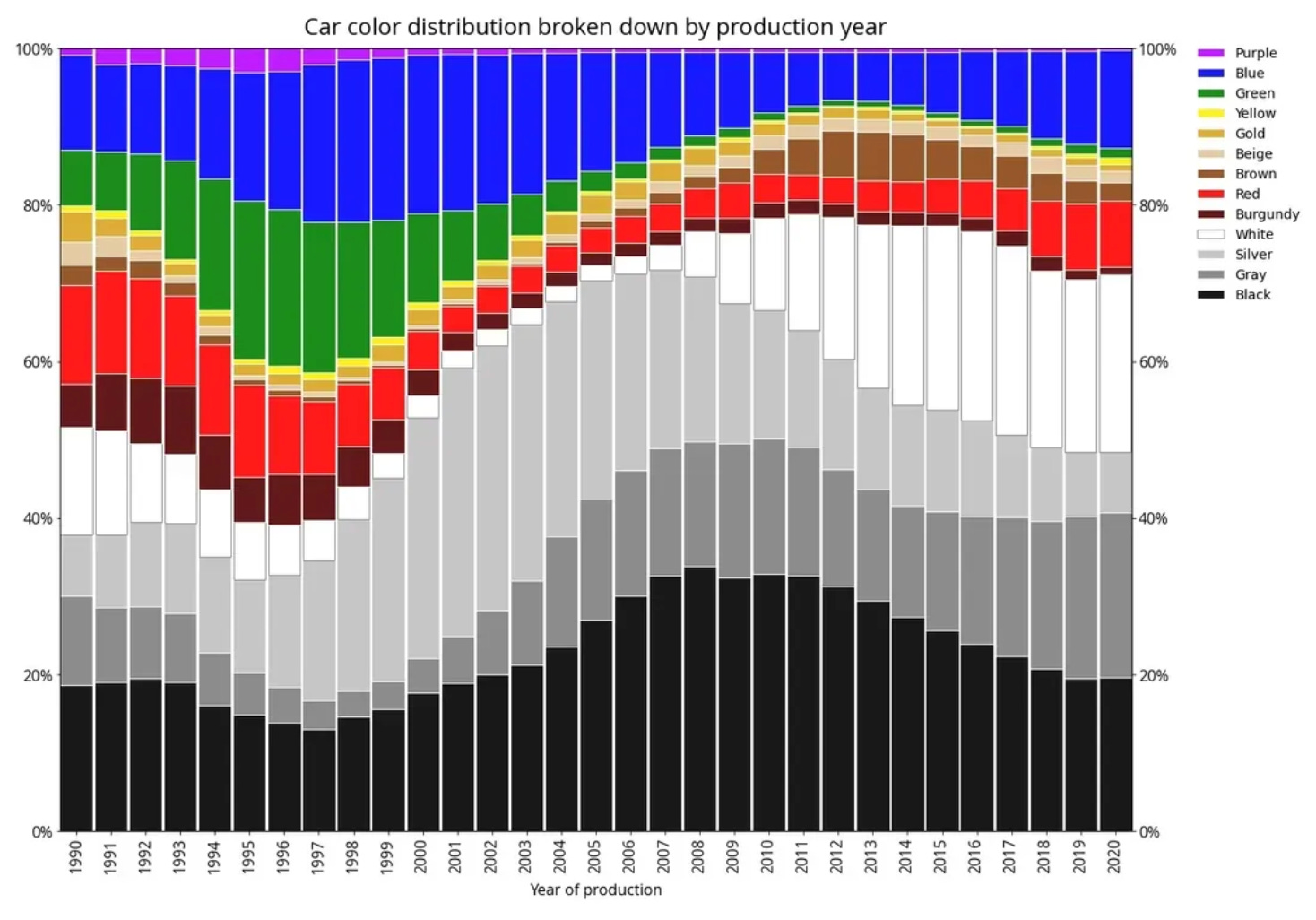 Car colours are now mostly black, white, or grey.