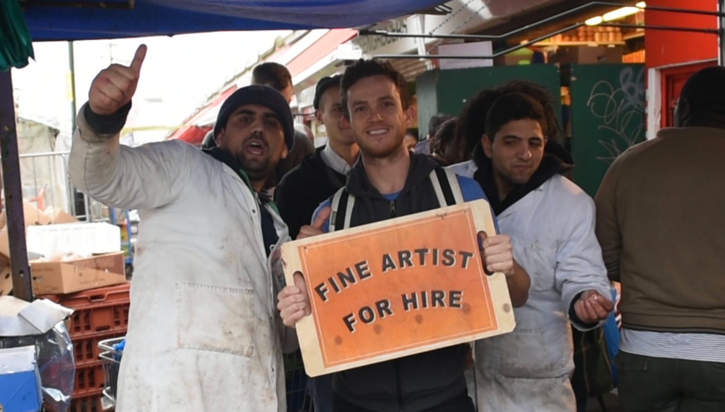 This is me in 2016 at Ridley Road Food Market in London hawking my services as a “fine artist.” It led to some interesting conversations with butchers and fishmongers like this fella. And I landed a paid commission to build a shoe rack for a yoga studio (random).