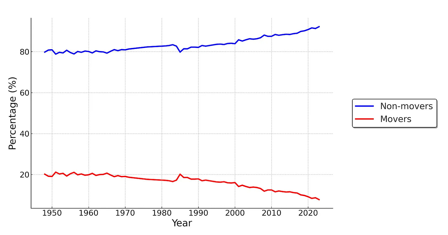 It’s not just teenagers. Crime rates have plunged since the ‘90s. Serial killing is down. There are fewer cults than ever. And fewer people move house.